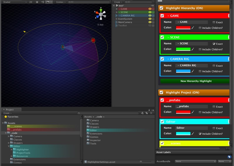 Apply color highlights to objects/folders in the project and hierarchy. Several options, like coloring children and partial matching.